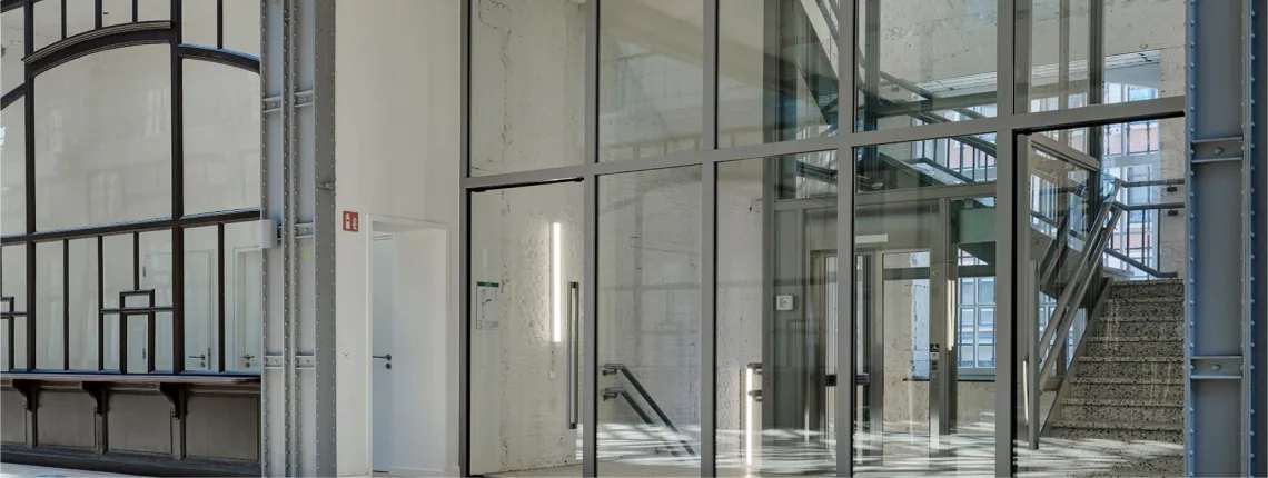 Passiver Schutz durch elegante Brandschutzglassysteme, die die Fluchtwege sichern und den Komfort und die Zirkulation verbessern.