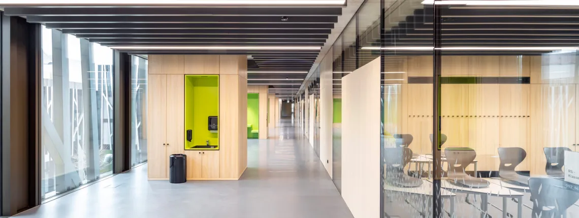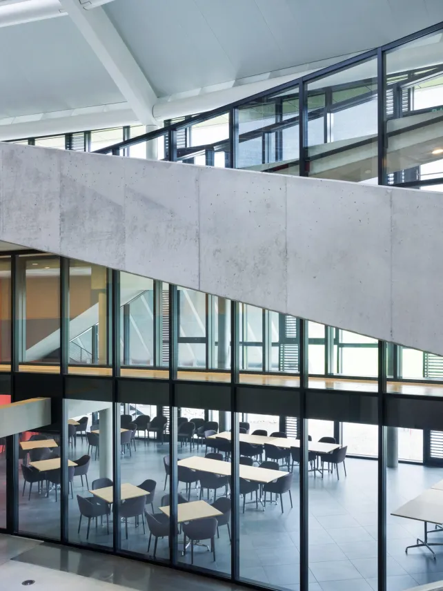 Glazen brandwerende en veiligheidsdeuren zorgen voor een open verbinding met de buitenwereld en laten tegelijkertijd overvloedig daglicht het gebouw binnenstromen.